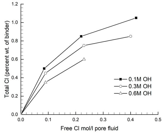 Dhir [58] and others [9,40,55,59] observed that the chloride binding capacity of cement pastes increased with increasing chloride concentration (see Figure 3). This was attributed to the sensitivity of the chloride binding capacity on the Cl−/OH− ratio in the pore fluid.