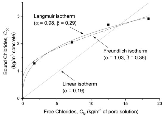 where Cb is the bound chloride content, Cf is the free chloride content and k is a constant of proportionality. This early model was proposed by Tuutti [114] and seems to be only valid for free chloride concentrations less than 20 g/L. Neither Tang [59] nor Ramachandran et al. [115] could subsequently find any linear relationship between bound and free chloride contents. According to Tang [59], the linear chloride binding isotherm gives an oversimplification of the bound chloride content, generating very high bound chloride contents at high chloride concentrations. However, linear relationships have been reported in non-marine field conditions [54,116], where chloride levels are typically below the limit proposed by Tuutti.