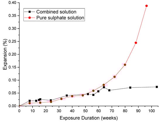 Meanwhile, Harrison [125] studied the effect of chlorides present in Portland cement mortar and concrete mixes on their sulphate resistance. Sodium chloride did not have any substantial effect on sulphate attack, while calcium chloride increased the rate of sulphate attack. However, recent findings [15], indicated by Figure 6, showed that sulphate expansion was significantly reduced in the presence of sodium chloride. This discrepancy can be explained by the duration of exposure, with the more recent study showing that the effects of chlorides on reducing sulphate-induced expansion were only visible beyond 65 weeks. This agrees with Hossain [136], in that the concomitant presence of chloride ions in a sulphate environment mitigates sulphate attack of plain and blended cements, attributed to increased solubility of ettringite and gypsum in chloride solutions [132]. This was slightly refined by Al-Amoudi et al. [123], who reported that chlorides mitigated sulphate deterioration in plain cements, but the effect was not great for blended cements incorporating GGBS, fly ash and silica fume.