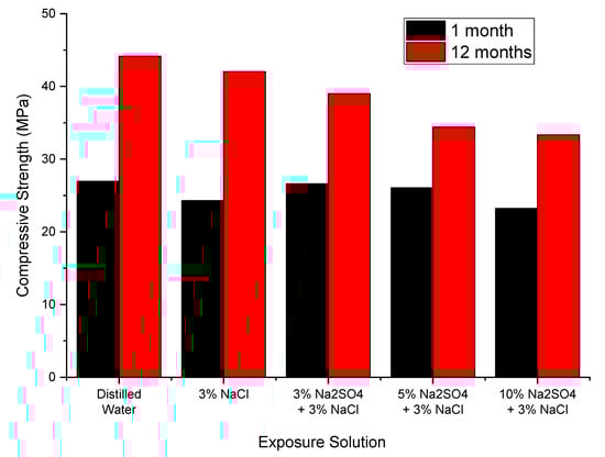 Figure 7 shows the changes in compressive strengths between exposure for 1 and 12 months to different combined chloride and sulphate solutions, as extracted from [18]. The chloride solution was kept constant at 3%, while the concentration of sodium sulphate was increased from 3% to 10%. Exposure for 1 month led to no discernable change in compressive strength. However, there was a clear trend, with increasing loss of strength with increasing sulphate concentration. This agrees with [129], where samples exposed to lower concentrations of combined solutions suffered less diminution in compressive strength than specimens exposed to higher concentrations.
