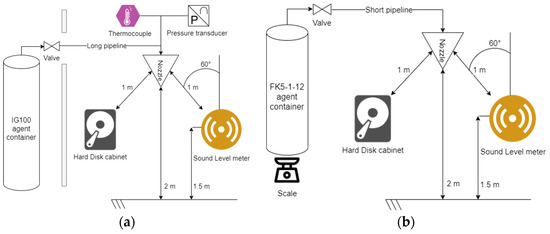 Schematic of the realized setup to evaluate acoustic performance by supplying (a) nitrogen IG100 or (b) FK-5-1-12.