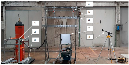Photo of the experimental setup: (1) storage cylinder; (2) pressure transducer and thermocouple (downstream of the valve); (3) scale; (4) pipeline; (5) pressure transducer and thermocouple (upstream of the nozzle, only for inert gas discharge system); (6) nozzle; (7) servers, including one SSD and two HDD; (8) sound level meter.