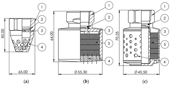 Technical sketch of the employed nozzles, with values provided referring to the orifice diameter: (a) standard; (b) silent; (c) silent for low ceiling applications; the marked components are (1) nozzle body; (2) spring; (3) orifice; (4) holes; (5) sound-absorbing layer.