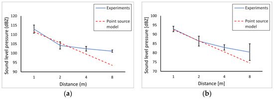 The point source model consists of assuming that sound radiates equally and symmetrically in all directions from the emitting source; as the underlying hypothesis, the source is far smaller than the wavelength associated with the emitted sound [22]. This spherical symmetry implies that sound intensity , where W is the power in the wave and r is the radius of the generic sphere, decreases according to the classic inverse square law (i.e., ∼) as distance from the source increases. Sound pressure follows an inversely proportional law (i.e., ) instead; SPL expresses sound pressure relative to a reference value through a logarithmic function (i.e., , where p is sound pressure, 0 refers to the reference value, and the unit for SPL is dB). Combining the previously reviewed relationships, a quantitative result from the point source model consists of SPL decreasing by about 6 dB each time the distance from the emitting source is doubled.