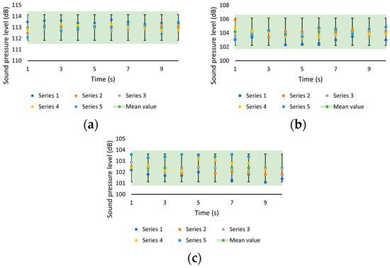 As reported in Section 2.2, error analysis was also carried out to assess the repeatability of the experiments. This evaluation was also conducted through the first set of tests (Table 3); notably, specific experiments were performed at fixed pressure against both standard and silent nozzles, where 10 s sampling time was applied to SPL measurements, varying the distance from the nozzle. Figure 6 shows the dataset acquired at 1, 2 and 4 m distance from the nozzle over the 10 s acquisition (overall, five series of acquisitions); as a representative example, the tests conducted with the standard nozzle are considered in the graphic.