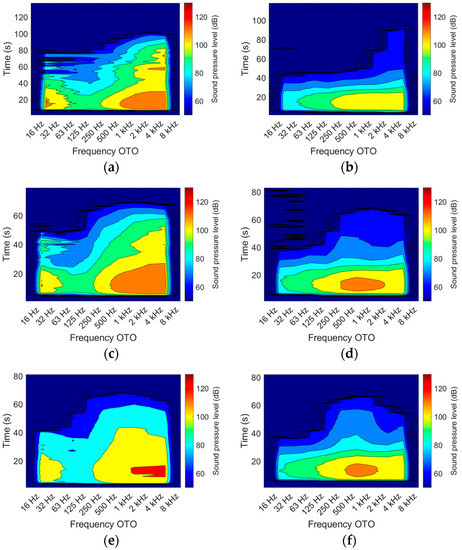 SPL as a function of time and OTO (One-Third Octave bands) frequency throughout a nitrogen IG100 discharge by (a) standard and (b) silent nozzle with 10 mm orifice diameter; (c) standard and (d) silent nozzle with 17 mm orifice diameter; (e) standard and (f) silent nozzle with 23 mm orifice diameter.