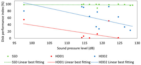 When comparing hard drive performance, the difference between configurations with the standard nozzle and those with the silent ones is highlighted by HDD performance index trends. As expected, solid-state storage devices (i.e., SDD) are almost not affected by external noise, hence SDD performance was close to 100% throughout each conducted experiment (Figure 7). The exhibited mild oscillations—in some instances even leading to performance higher than the nominal one (i.e., greater than 100%)—appear unrelated to the actual experimental conditions. On the other hand, HDD performance decay is highly consistent with SPL exceeding the 110 dB threshold; moreover, the higher the SPL, the greater the performance decay (Figure 7). This observation is particularly emphasized by HDD1, which is the hard drive featuring the smaller rate of rotation, and consequently, the lower nominal speed (Table 2); HDD2 seemed less affected by noise, to the point of having its performance almost unaffected by SPL lower than 120 dB and also by noise regrowth for a short timespan (Figure 7c,g). It is also worth noting that HDD1 did not recover its performance level under undisturbed conditions as noise fell below the threshold, due to the discharge by the standard nozzle approaching the end of the process (Figure 7c,g,i); this phenomenon never appeared in tests run with silent nozzles instead. This prolonged performance loss occurring with the discharge produced by standard nozzles with large orifice diameters is arguably due to SPL being above 100 dB at frequencies greater than 4 kHz over a wide portion of the discharge event (Figure 8a,c,e). As previously reported, Dutta suggests that hard drives are affected by SPLs as low as 105 dB in the 4–10 kHz band [31], which may explain the result of only partial recovery even when noise fell below 110 dB. The diagram of Figure 9 serves as an overview of the impact of noise from the tested nozzles on hard drives: (maximum) performance loss is plotted against maximum SPL reached for each tested condition, including both standard and silent nozzle experiments. An apparent correlation between HDD read/write speed and noise appears from the performance dataset, with HDD performance becoming lower as SPL increases. The linear best-fitting curve, applied to each database related to the three tested hard drives, emphasizes that noise is more impactful against the HDD featuring lower nominal speed with respect to those with higher rates of rotation.
