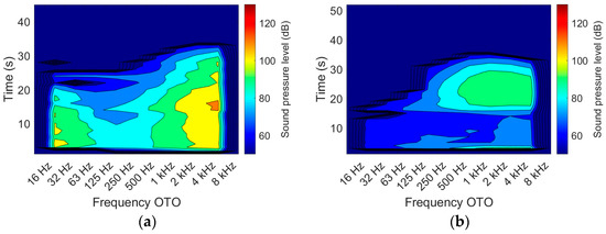 SPL as a function of time and OTO (One-Third Octave bands) frequency throughout FK-5-1-12 discharge by (a) standard and (b) silent nozzle for low ceiling applications with 6 mm orifice diameter.
