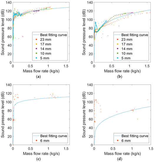SPL as a function of released mass flow rate, with data points (referred to orifice diameter) and best-fitting curve: (a) standard nozzle and nitrogen IG100 discharge; (b) silent nozzle and nitrogen IG100 discharge; (c) standard nozzle and FK-5-1-12 discharge; (d) silent nozzle for low ceiling applications and FK-5-1-12 discharge.