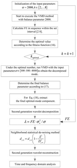 The energy criterion was also widely used in parameter selection. The transient state corresponds to the state of energy distribution deviating from the system, which means that the pulse-like frequency characteristics can be measured by energy changes. The varying features of the center frequency of extracted modes are thereby investigated [17,18], with initial center frequencies, in which the converging U-shape phenomenon is found. In the same direction, an energy-driven VMD method based on spectrum division and the Gini index is proposed for the adaptive decomposition of rolling bearing fault signals [19]. Sparsity is a very useful concept that has become a research hotspot in the field of mechanical signal processing in recent years. Due to the introduction of compressed sensing, sparse diagnosis has aroused the great interest of scholars. Since it can be assumed that this corresponds to mechanical failure rather than normal behavior, the sparsity feature can also be used to find and optimize VMD parameters [20]. However, it is still difficult to characterize the fault attribute only by sparsity since the impulse behavior induced by local damage of bearing is periodic fluctuation and attenuation oscillation. In view of this, some research work has explored the strategy of multiple index fusion [21,22,23]. A permutation entropy and orthogonality-based mode number adjusting procedure was conducted by [24]. Ref. [25] presented a parameter extraction method based on the characteristics of the intrinsic mode function. This method quantifies VMD results based on the comprehensive consideration of permutation entropy, frequency domain extremum, kurtosis criterion and energy loss coefficient. Recently, scholars suggested that the initial center frequency and balancing parameter of reconstructed specific subcomponents could be determined adaptively according to the dominant frequency of the remaining signals decomposed by the previous iteration, making VMD an adaptive signal decomposition algorithm [26]. Although the above methods improve the VMD performance to some extent, they still have shortcomings in maximizing the periodic pulse information because the bearing fault impact signal consists of transient and fluctuation, and the existing research work only focuses on the transient characteristics. Another important research topic of VMD for bearing fault diagnosis is high-frequency mode noise elimination. This is different from the general idea of noise elimination because the signal is in the high-frequency band, and the waveform shows certain oscillations, while the noise component is attached to the oscillation waveform, showing overall sparsity and smoothness. Therefore, after deeply discussing the FE guided-VMD, we propose a neighborhood statistical de-noising (NSD) method based on the second-generation wavelet transform (SGWT) and FE, which not only considers the neighborhood statistical property but also makes full use of the oscillation attenuation and tight support of the SGWT.
