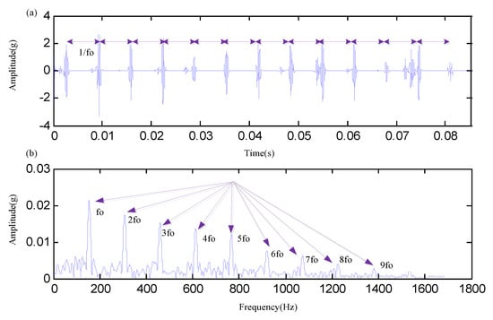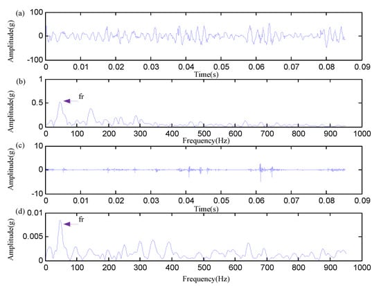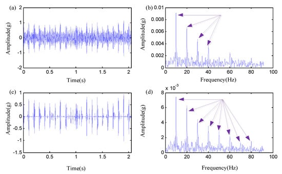 As the massive implantation of noise interference, the sparseness and characteristic frequency of signal impulse are gradually submerged in the noise and are becoming less observable in Figure 2. After the optimal VMD processing with = 3 and = 500, it retains a large amount of signal amplitude and highlights the periodic impulse waveform, which makes it easier to identify the real impulse in the time domain and frequency domain, as displayed in Figure 3a,b. Although the deterministic interference component is eliminated, the impulse characteristics are still ambiguous due to the serious noise pollution, and the high-order harmonic frequency of the envelope spectrum is partially lost. We further use the NSD method to extract useful signals, and the results are shown in Figure 3c,d. It can be seen that only a few distinguishable fake impulses remain in the de-noising results, and the higher harmonic frequencies of the envelope spectrum are significantly enhanced, which is very valuable for practical engineering diagnosis. For comparison, the same simulation signal is analyzed by Minimum Entropy Deconvolution (MED) methods [32]. The results of MED are shown in Figure 4. Due to the interference of AM-FM and random noise, the periodicity can hardly be observed in the MED-filtered signal, and the characteristic impulse frequencies of the envelope spectrum are also extremely weak.