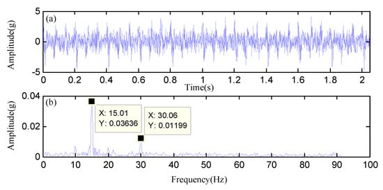 The test signal used in this case comes from the rolling bearing fault test bench (Figure 5) in the intelligent maintenance system (IMS) center [33]. The test bearings were Rexnord za-2115 double-row bearings, and the shaft speed was fixed at 2000 rpm. The radial load applied to the bearing was 26.7 kN. The sampling frequency was 20 KHZ. At the end of the experiment, local defects were found on the outer race of bearing 1, and the characteristic fault frequency of the outer race is fo = 236 Hz.