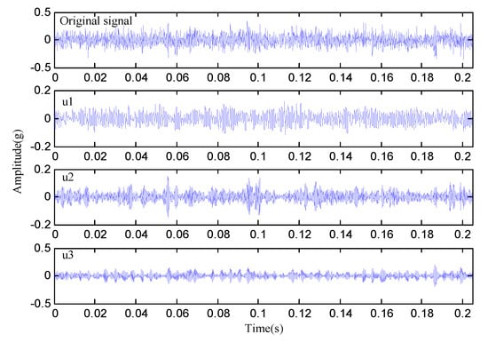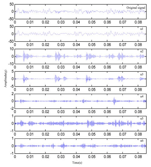 We typically analyze early fault signals during fatigue testing. Due to the vibration superposition effect of multiple bearings and the strong interference generated by a testing machine, it is basically difficult to obtain effective fault information at the early stage of the fault. Then, the proposed method is employed to better the detection result. Figure 11 shows the decomposition results using the parameters with = 6, = 200. The mode u3 calculated by Equation (18) is selected as the sensitive mode to extract fault features. The de-noising signal by NSD and local envelope spectrum is displayed in Figure 12. It can be seen that the de-noising signal is considerably sparse and has a periodic structure in which the fault cycle period of the inner race and modulation components induced by the rotation period is clearly visible on the waveform. It should be pointed out that since the bearing inner race rotates with the shaft, when the inner race fails, the fault frequency fi will be modulated by the rotation frequency fr, and obvious modulation will naturally occur in the envelope spectrum. As shown in Figure 12, this modulation phenomenon is well reflected in the time and frequency domains, thus verifying the reliability and accuracy of the diagnosis results.