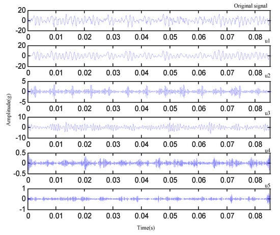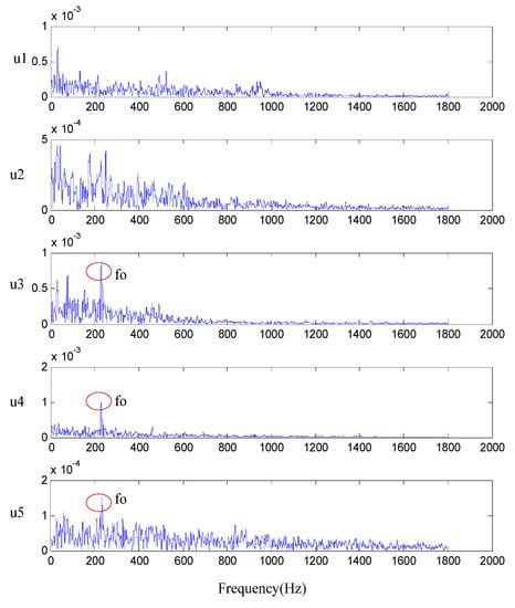 Performing numerical calculations, the decomposition mode number , balance parameter and Lagrange multiplier are specified in advance, and other original conditions are initialized to zero. Subsequently, the mode and center frequency are updated iteratively by Equations (4) and (5), respectively.