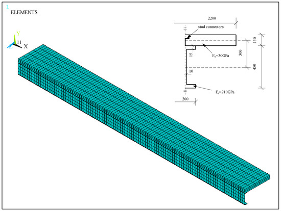 There are many types of research on the finite element analysis of ordinary reinforced concrete beams, but there are few types of research on steel–concrete composite beams. The main reason is that many element forms exist in steel–concrete composite beams. Therefore, different elements should be selected to simulate various element components in steel–concrete structures, such as concrete, connectors, and steel beams. At the same time, the slip between concrete and steel beams and the concrete cracking in the negative moment zone of continuous composite beams should be considered. Therefore, most of the tests focus less on theoretical analysis for the study of steel–concrete composite beams. In 1997, Oven et al. [28] proposed a two-dimensional nonlinear finite element differential method based on the principle of virtual work to simulate simply-supported beams and continuous composite beams. In 1998, Salari et al. [29] proposed a new finite element method for composite beam elements with an unknown force. The Hermitian interpolation polynomial was used to cause the curvature to be linearly distributed, which reduced the solution’s accuracy to a certain extent. Therefore, the force-based model was more accurate than the displacement-based model. In 1999, Gattesco et al. [30] further proposed a four-node element in which each node has three degrees of freedom in the composite beam element. This assumption is different from other models in that the shear connector transfer is considered to be discontinuous and to fit the actual engineering state better. In 2000, Ayoub et al. [31] established an inelastic element based on the hybrid method. They analyzed the action of partially shear-connected composite beams under monotonic and cyclic loads. The model assumes that the spring is located at the element’s end, and the connection force is assumed to be linearly distributed within the element. In 2003, Qiu et al. [32] adopted the double-layer beam element analysis method, which regards the shear connector as a particular beam element. The two ends are rigidly connected with the steel beam and concrete to ensure that the two are bent together. Fang et al. [33] used the shear connector of the cantilever beam element to artificially increase the cross-sectional area of the connector to avoid excessive vertical deformation between the steel beam and the concrete slab. Wei [34] and others began to use spring elements to simulate shear connectors. Concrete and steel beams use three-dimensional solid elements to analyze composite beams’ deformation and elastic bearing capacity. In Miranda et al.’s work [35], the viscoelastic response of four steel concrete composite beams affected by changing environmental conditions was studied using a finite element model. The simulation results were basically consistent with the current formula, proving the applicability of the finite element model. In Sarfarazi et al. [36], the effects of crack separation and the bridge area on the tensile behavior of concrete were studied experimentally and numerically through the Brazilian tensile test. The visually observed failure process gained through numerical Brazilian tests was found to be very similar to that obtained through the experimental tests. Wang et al. [37] established a finite element model (FEM) of simply-supported composite slabs while considering the impacts of non-uniform shrinkage, cracking in the concrete, and the creep of the concrete; then, the reliability of the FEM was verified against the experimental data in the literature.