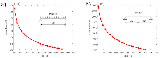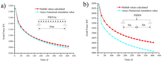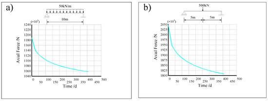 Table 4 shows that regardless of the type of stud stiffness, the maximum error between the calculated value and the numerical simulation value is 0.71%. With the increase in stud stiffness, the axial force decreases more in the same creep time under the formula calculation results, which are 72.56 kN, 131.37 kN, 156.73 kN, respectively. The change rate is 7.09%, 11.05%, and 12.50%.