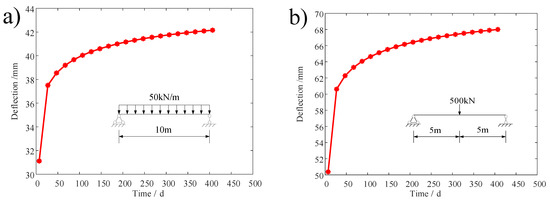 - Liu, Y.; Liu, X. Long-term deflection of steel-concrete composite box-beam due to creep. J. Railw. Sci. Eng. 2015, 12, 317–322. (In Chinese) [Google Scholar]