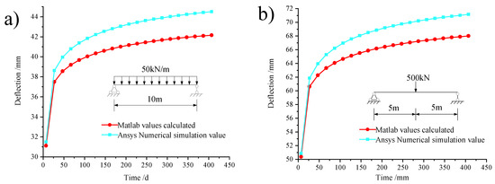 Table 5 shows that regardless of the stud stiffness, the maximum error between the calculated and numerical simulation values is 5.65%. With the increase in stud stiffness, the deflection increases more in the same creep time under the formula calculation results, which are 11.92 mm, 13.01 mm, and 13.57 mm, respectively. The change rate is 31.97%, 41.30%, and 46.60%.