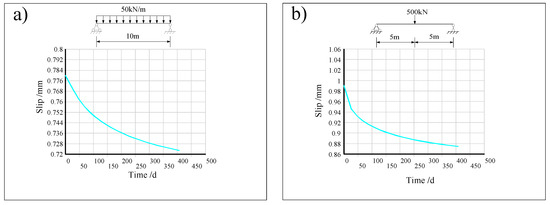 Figure 22 shows the curves of the slip size of the composite beam end considering the change in creep with time calculated by the formula derived by the MATLAB software. It can be seen that when the loading age is 7 d under a uniform load, the slip of the composite beam end is 0.8182 mm, and the slip decreases to 0.7408 mm at 407 d, which is reduced by approximately 9.46%. When the loading age is 7 d under a concentrated load, the slip of the composite beam end is 1.0323 mm, and the slip decreases to 0.9081 mm at 407 d, which is reduced by approximately 12.03%.
