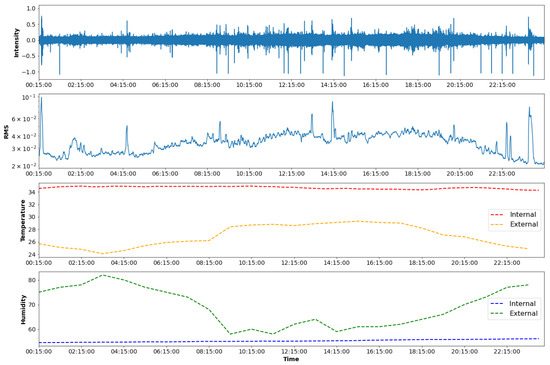 Moreover, local external temperatures, humidity, and rainfall amounts levels were obtained from the Environment and Climate Change Canada website (https://climate.weather.gc.ca/, accessed on 1 June 2022.). A representative example of a 24 h snapshot of the changes in internal/external temperature and humidity levels, as well as the audio intensity and root mean square (RMS) value, is shown in Figure 2. The plots are for a strong and healthy colony in August with one brood chamber and two honey supers with a total of 30 frames of bees (covered with at least 70% of bees). As can be seen, audio power increases during the day, especially during periods in which external temperatures were increasing and external humidity levels decreasing, thus suggesting increased foraging activity and thermohygrometric regulation of the colony.