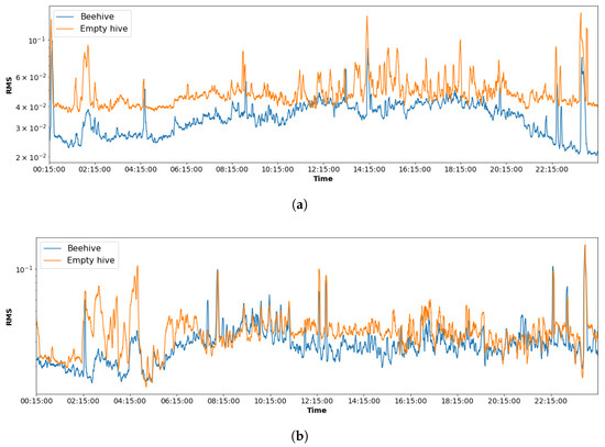 RMS curves of a typical colony with three full boxes of bees (blue curve) and an empty box (orange) as measured on (a) 12 August 2021, and (b) 24 September 2021.