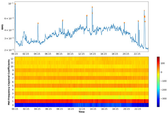 In this experiment, a Hann window with a length of 125 ms with a 50% overlap was used in step 2. A total of 12 coefficients were extracted in step 5, plus the zeroth coefficient, which was used as a measure of signal power. Figure 5 shows the 12 MFCCs, plus the zeroth coefficient, as computed over the 24 h duration of the previous audio signal. In Section 3, more details will be provided on the effects of ambient noise on the MFCCs.