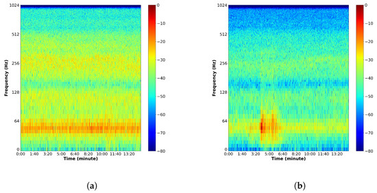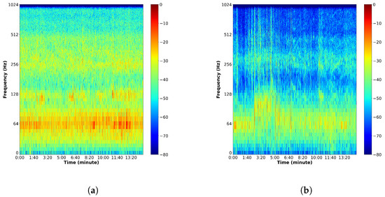Spectrogram comparisons (a) without and (b) with heavy rainfalls.