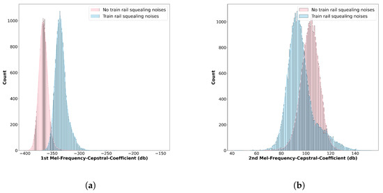 Comparison of the changes in distribution of the (a) first and (b) second mel frequency cepstral coefficient with and without the presence of train rail squealing sounds.