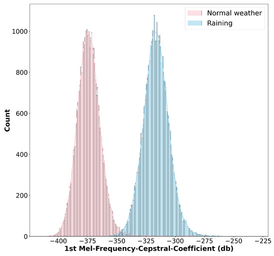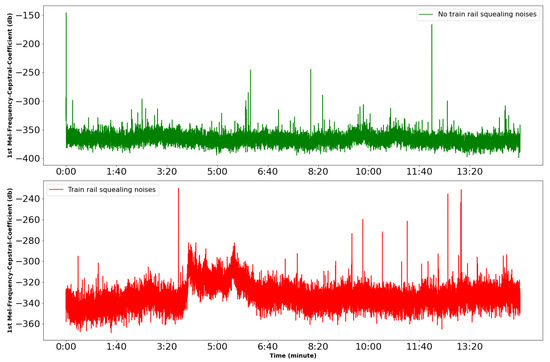 Next, we explore the effects that such urban sounds may have on MFCCs. Figure 7 shows the histograms of the distribution of the first two coefficients (subplots and and b, respectively) across time instances in which the train sound was present versus absent. As can be seen, the train rail squealing sound has a substantial effect on the distribution of the MFCCs; in the case of the first coefficient, it increases the value by around 50 db. Such effects may result in erroneous decisions by automated systems that rely on the first three mel-frequency cepstral coefficients, such as the systems described in [3,30,31]. Figure 8 depicts the temporal changes seen in the first MFCC when the train passes by (see subplot b around the 5 min time). For systems that rely on average MFCCs over time, such increases will likely result in errors.