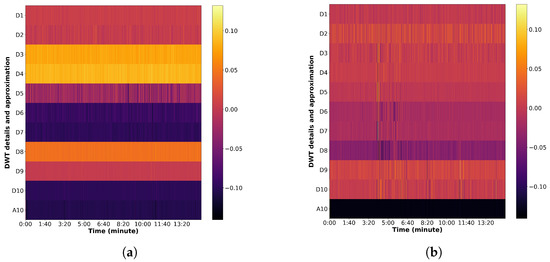 Lastly, Figure 9a,b depict the DWT detail (D1-D10) and approximation (A10) components extracted from the clean and noisy segments, respectively. As can be seen, the detailed coefficients are particularly affected by this urban noise source, and would likely result in errors for systems that rely on DWTs, such as the ones described in [29,31].
