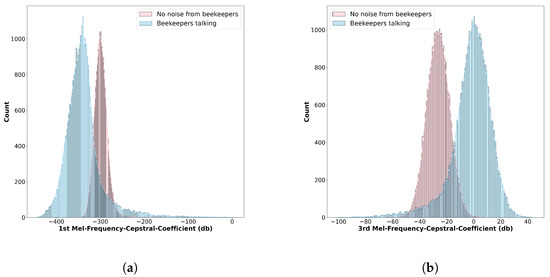 Speech of people talking near the beehives is another common noise source when it comes to audio-based monitoring systems. Male speech, for example, is known to have fundamental frequencies ranging from 80 to 150 Hz, whereas female speech ranges from 160 to 250 Hz. These are typical ranges at which beehive acoustics are monitored, and thus the system performance could be severely compromised. The spectrograms in Figure 10b, for example, show scenarios in which speech is not present (plot a) near a particular hive and when beekeepers are talking near the same hive (plot b). Next, the histogram of the distribution of the first and third MFCCs shown in Figure 11 shows the impact due to speech artifacts. Similar changes in the DWT detail and approximation components can be seen in Figure 12.