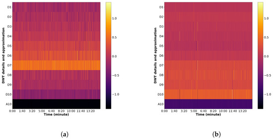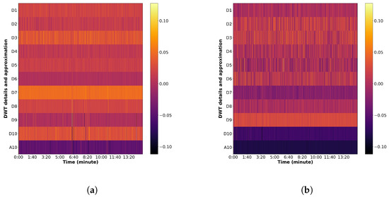Here, we used the second order Daubechies wavelet [62] (“db2”) and 10 levels of decomposition based on combinations reported in the literature.