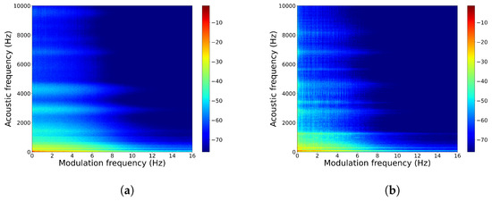 The modulation spectrogram is a frequency–frequency representation that helps us to study the temporal dynamics of spectral components. Features extracted from the modulation spectrum have been used widely in human speech analysis, as they provide increased robustness against environment noise; representative examples include speaker identification [63] and speech emotion recognition [64], to name a few. If we consider the spectrogram as , the modulation spectrogram can be calculated as follows: