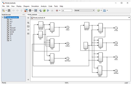 The metaheuristic algorithms have been executed on Intel® Core™i7-8700 CPU @ 3.20 GHz, 3192 MHz (ASBIS Bulgaria Ltd., Sofia, Bulgaria), 32 GB Memory (RAM), Windows 10 pro (64 bit) operating system. Matlab and Simulink R2019a environment are used. Based on the presented pseudocodes (Algorithms 1–4), the algorithms are implemented in Matlab code. Mathematical model of corn steep liquor TSAD process (Equations (1)–(9)) is presented as a Simulink file (see Figure 1). Solver options are fixed-step size of 0.01 and ode4 (Kunge-Kutta) with TIMESPAN = [0 12].