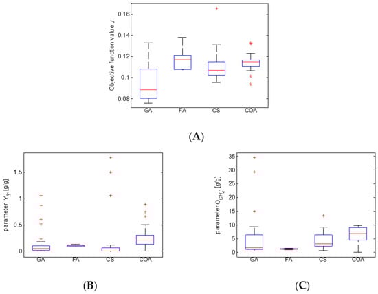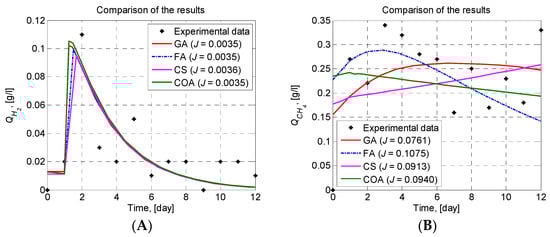Since there are no reported parameter values for the proposed model or similar, it is not possible to determine which parameters, i.e., which model is the best. In such cases, a graphical comparison can clearly show if the model follows the experimental data, i.e., the presence or absence of systematic deviations between the model predictions and the experimental measurements. Such a quantitative measure is also an important criterion for the adequacy of the models proposed here. The model predictions of the state variables and , based on GA, FA, CS, and COA estimated set of model parameters, have been compared to the experimental data of the TSAD of corn steep liquor in Figure 2. J is the value of the mean least square error for each model (Equations (12) and (13)).