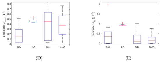 The performance of the considered metaheuristic algorithms has been statistically evaluated by comparing the observed average value, standard deviation (SD), and the median of the estimated model parameters and the obtained objective function value J2. A statistical analysis of the suggested algorithms in terms of average, SD, and median on the results for the second identification step is presented in Table 3. Only the second set of estimated model parameters, observed in the case of modelling the processes in BR2, is presented and discussed because of their crucial role and significance.