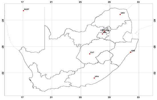 The dataset used in this study was collected from the SAURAN (Southern African Universities Radiometric Network) website https://sauran.ac.za/, accessed on 13 August 2022. Eight radiometric stations were selected for the study. These were the only radiometric stations from SAURAN that had clean data for the sampling period used. However, future research will include the use of satellite data and more stations, including the use of gridded data covering the whole country.