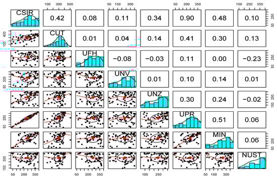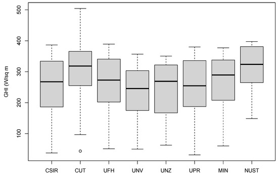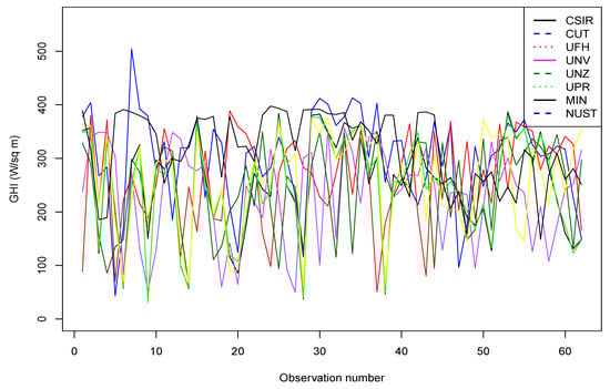 The stations are CSIR—CSIR Energy Centre (1), CUT-Central University of technology (2), UFH-University of Fort Hare (3), UNV-University of Venda (4), UNZ-University of Zululand (5), UPR-University of Pretoria (6), MIN-CRSES Mintek (7) and NUST-Namibian University of Science and Technology (8). The covariates used in the study are temperature, relative humidity, wind speed, wind direction, wind direction standard deviation, barometric pressure, month, day, noltrend (nonlinear trend variable), elevation, and the dependent variable GHI. R statistical software was used for all the analyses that were done in this study.