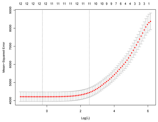 In order to select significant variables for the analysis, ElasticNet, a regularization technique, was used [21]. ElasticNet is a shrinkage method that uses penalties from ridge regression () and Lasso regression () to reduce the number of variables in a regression model. It combines both ridge and Lasso methods to overcome their limitations. Elastic net minimizes the function in Equation (1).