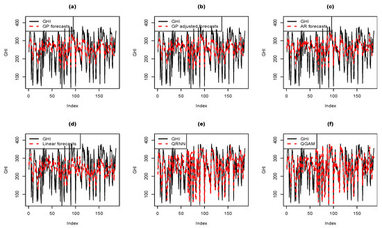Plots of GHI with forecasts from (a) GP, (b) GP adjusted (c), AR (d) Linear models and combined forecasts using (e) MCQRNN and (f) QGAM.