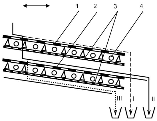 Design and technological scheme of arrangement of sorting sieves and ball cleaners. 1—top sorting sieve; 2—lower sorting sieve;3—reflective rod surfaces of ball cleaners; 4—rubber balls; I—large fraction, II—medium fraction; III—small fraction.