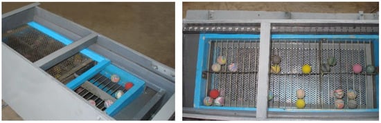 According to this arrangement of sieves, the total bones volume was divided into three fractions: large I, medium II and small III. The upper sieve 1 is designed to isolate a large fraction of the bones, and the lower sieve 2—for the middle. Sieves had circular openings, which provided the separation of the bones in width. To clean stuck bones from the holes in the sieve, the ball cleaners were set under the sieves, consisting of rubber balls (4), located on the reflective rod surfaces (3). The balls exert a shock effect on the sieves, knocking the stuck bones out of the holes [25,26,27]. According to the results of previous theoretical research, the following optimal values of the parameters of the ball cleaner were obtained [2]: