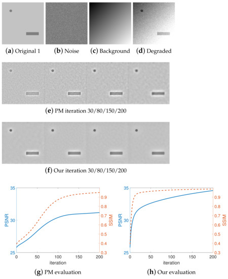 Here, means an initial estimation of the background. Figure 1 shows the traditional evolution and the proposed evolution on an artificial image with two suspect areas. The first row shows the original image, the noise, the inconsistent background and the degraded image. As shown in Figure 1d, the clear image is polluted by Gaussian noise (Signal to Noise Ratio, SNR = 20) and an inconsistent background. The top-left seems underexposed, and the bottom-right looks overexposed. With PM model performance, the noise removal and edge preservation can be well balanced under the influence of an inconsistent background (as shown in Figure 1e). Applying our model on the degraded image, noise and inconsistent background are both reduced while the edge is preserved (as shown in Figure 1f). The PSNR curve and SSIM curve are shown in Figure 1g,h.