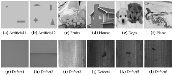 In this section, the proposed method will be performed on some experiments for detailed evaluation. The test images are shown in Figure 2 and the first two are artificial ones. The subsequent four are randomly selected from classical image datasets, such as miscellaneous of USC-SIPI (http://sipi.usc.edu/database/, accessed on 1 September 2022). The last six are collected from real industrial scenes.