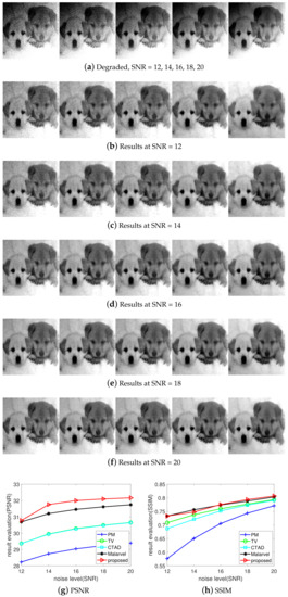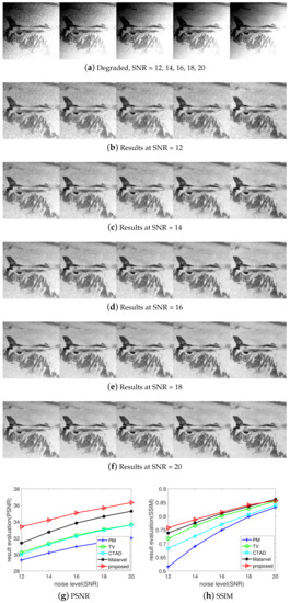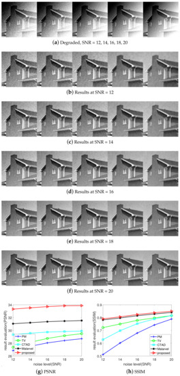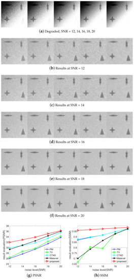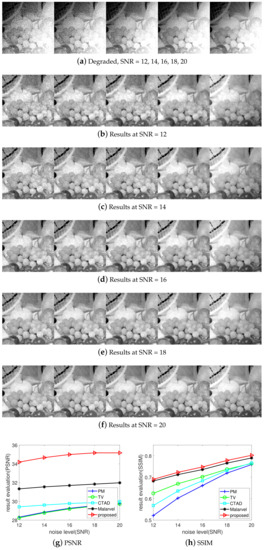 In this experiment, a more inhomogeneous artificial background is added to the two natural images with five levels of noise (SNR = 12, 14, 16, 18, 20) as shown in Figure 6a, Figure 7a, Figure 8a and Figure 9a.
