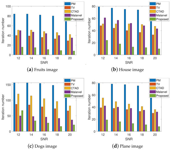 The results are evaluated by two metrics (PSNR and SSIM) for full comparison. It can be found that the proposed method achieves the best performance in each degradation level. About the artificial image 1, our PSNR is on average 6.88% higher than the other four methods, while the SSIM is at least 2.05% higher than the traditional results. More details refer to Figure 3g,h and Table 1. A similar situation can be found on the test of artificial image 2, as shown in Figure 4 and Table 2. The iteration numbers are shown in Figure 5. Fewer iterations are required by our method.