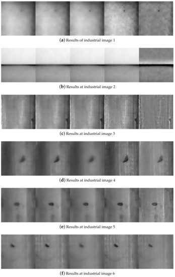In this experiment, the five methods are applied to process six industrial images with some defects as shown in Figure 2g–l.