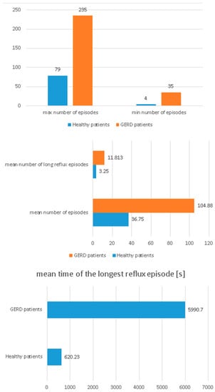 Statistical analysis of some of the total DeMeester counts for the healthy and GERD patients also delivered some interesting details. They are shown in Table 3. The mean number of reflux episodes in the healthy pH courses was 36.75, whereas in the GERD patients it was 104.88—more than twice the number. The maximum number of reflux episodes for a healthy patient was 79, whereas for an unhealthy patient it was 235; the minimal number of reflux episodes for a healthy individual was 4, whereas for a sick patient the minimal number of reflux episodes was 35. Such data show a significant difference in the number of reflux episodes, which again is expected on the basis of the DeMeester criteria. Some GERD patients experience a higher number of episodes (even up to 10 in an hour) where their esophageal pH changes rapidly, whereas some patients have only 1–3 episodes per hour, but their duration is significantly longer and more steady. A graphical interpretation of the relevant data is shown in Figure 1. However, it should be noted that these are only aggregate statistics as the diagnosis of gastroesophageal reflux disease based on the total DeMeester count is carried out individually and is very individual. Therefore, it is very important that the diagnostics based on this method are carried out by a specialist gastroenterologist who is able to properly interpret the pH-metry records, confronting the result of the total DeMeester count calculation with the pH course.