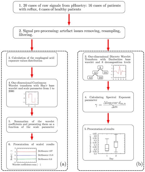 A flow chart for the methodology of analysis for esophageal pH monitoring signal: (a) calculation of the sums of wavelet coefficients (CWT), (b) based on spectral exponent parameters.