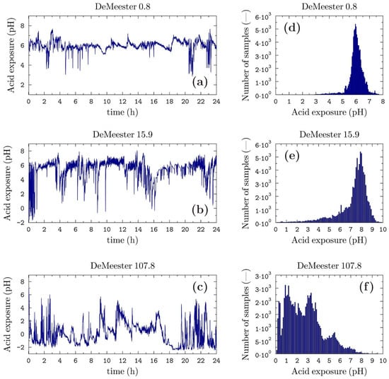 The pH-metry signal measured and the corresponding pH value distributions: (a,d) calculated DeMeester score = 0.8; (b,e) calculated DeMeester score = 15.9; (c,f) calculated DeMeester score = 107.8.